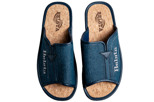 Опаковка: Мъжки отворени чехли BELSTA от тъмносин деним с бродерия и еко кожа\Size set: Men’s Open Slippers BELSTA from Dark Blue Denim with Embroidery and Eco-Leather Insert