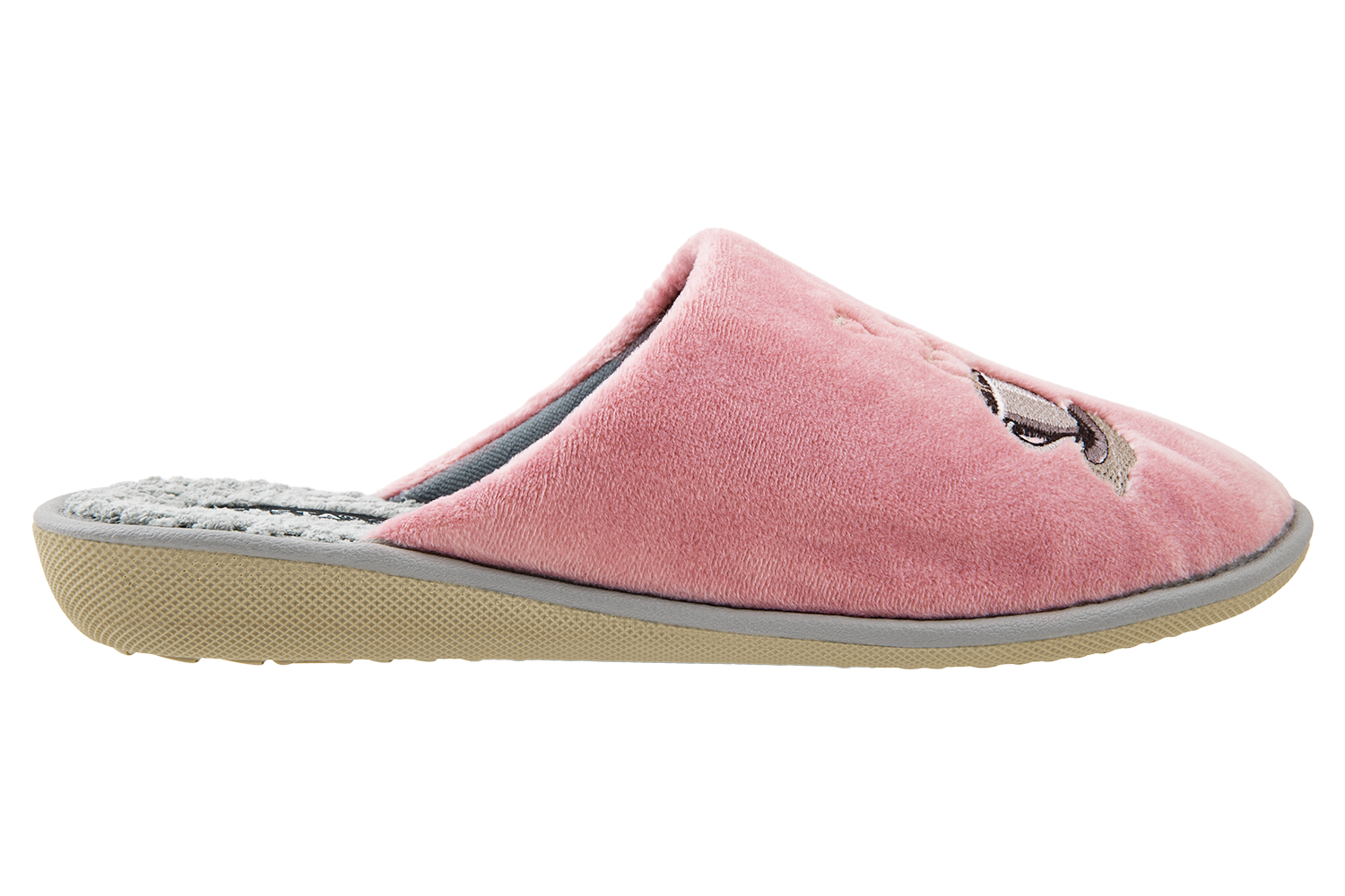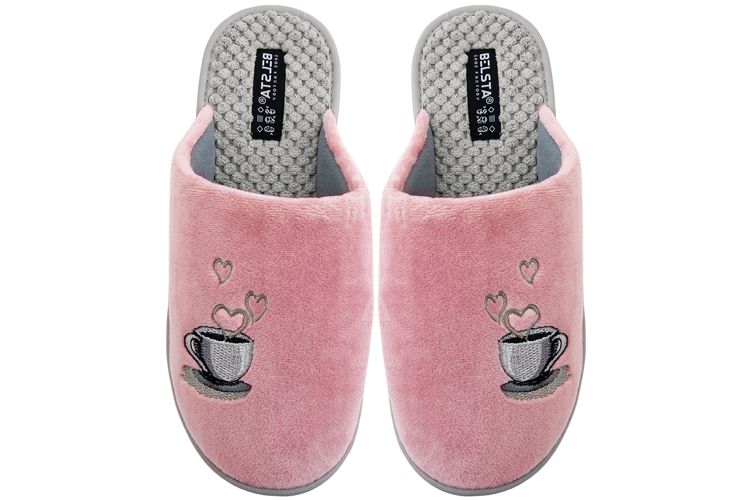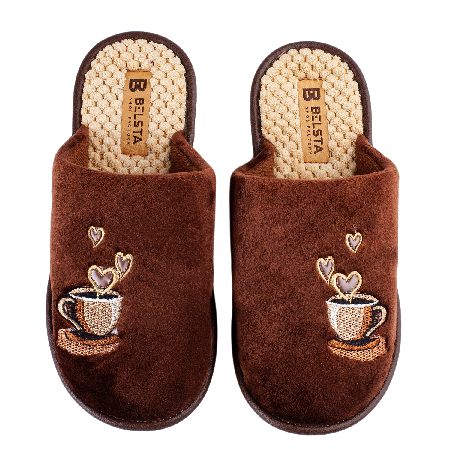 Women’s closed BELSTA slippers in beige velour with coffee cup embroidery.